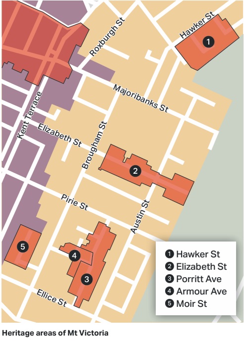 Mt Victoria has heritage precincts around Moir Street, Armour Avenue, Porritt Avenue, Elizabeth Street and Hawker Street.In addition, the suburb holds around 30 heritage buildings or structures.